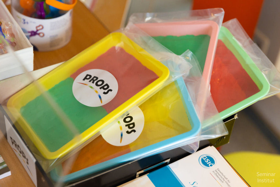 Unser PROPS Clay Tray ist eine längliche Tasse, die mit einer Art Knetmasse gefüllt ist, die nicht lufttrocknend ist. Zweck des Clay Tray ist es, beim Zeichnen und Schreiben gegen den Widerstand zu arbeiten und dabei dem Gehirn verstärkte propriozeptive Information zu schicken, was eine bessere Abspeicherung von Bewegungsplänen ("Muskelgedächtnis") bewirkt. Außerdem kann diese Kraftaktivität organisierend auf das Gehirn wirken.